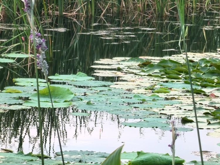 4湿地水生雅趣|昆山湿地一隅,荷叶田田,紫色的水生植物点缀其间,水面如镜,倒映着自然的生机与宁静,尽显水乡的灵秀之美。|