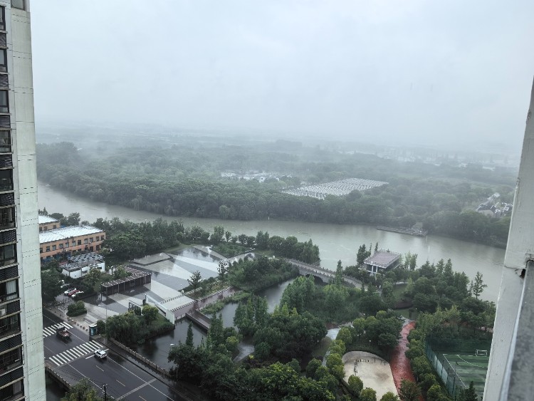 2雨中昆城景致|从高楼俯瞰,昆山在雨中朦胧一片,河流蜿蜒穿过城市,绿树、建筑与道路在雨幕中构成独特的城市景观,展现别样韵味。