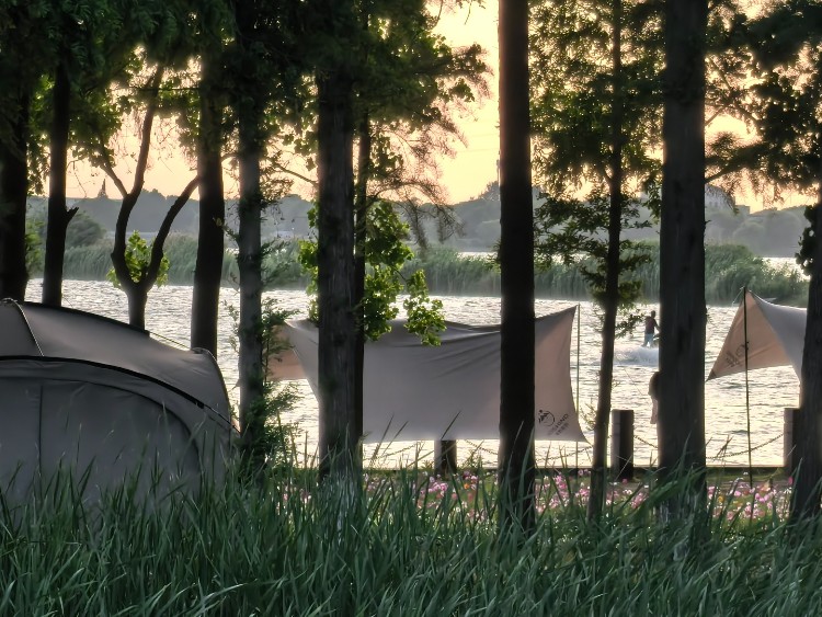 照片1湖畔露营时光|在昆山的湖畔树林间,支起帐篷,天幕在阳光中半掩,远处有人在水面嬉戏,尽显惬意的户外生活,自然与休闲完美融合。|