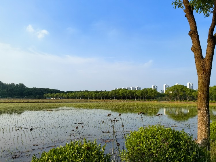 3城郊田园风光|昆山城郊,广阔的水田波光粼粼,树木整齐排列,远处高楼林立,蓝天如洗,呈现出城市与田园共生的和谐画面。