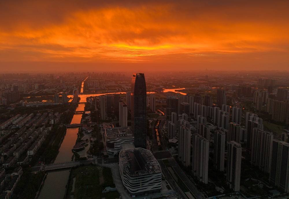 霞光把天空映得五光十色,把昆山构成了一幅壮丽的图景,满天火红,太美了!