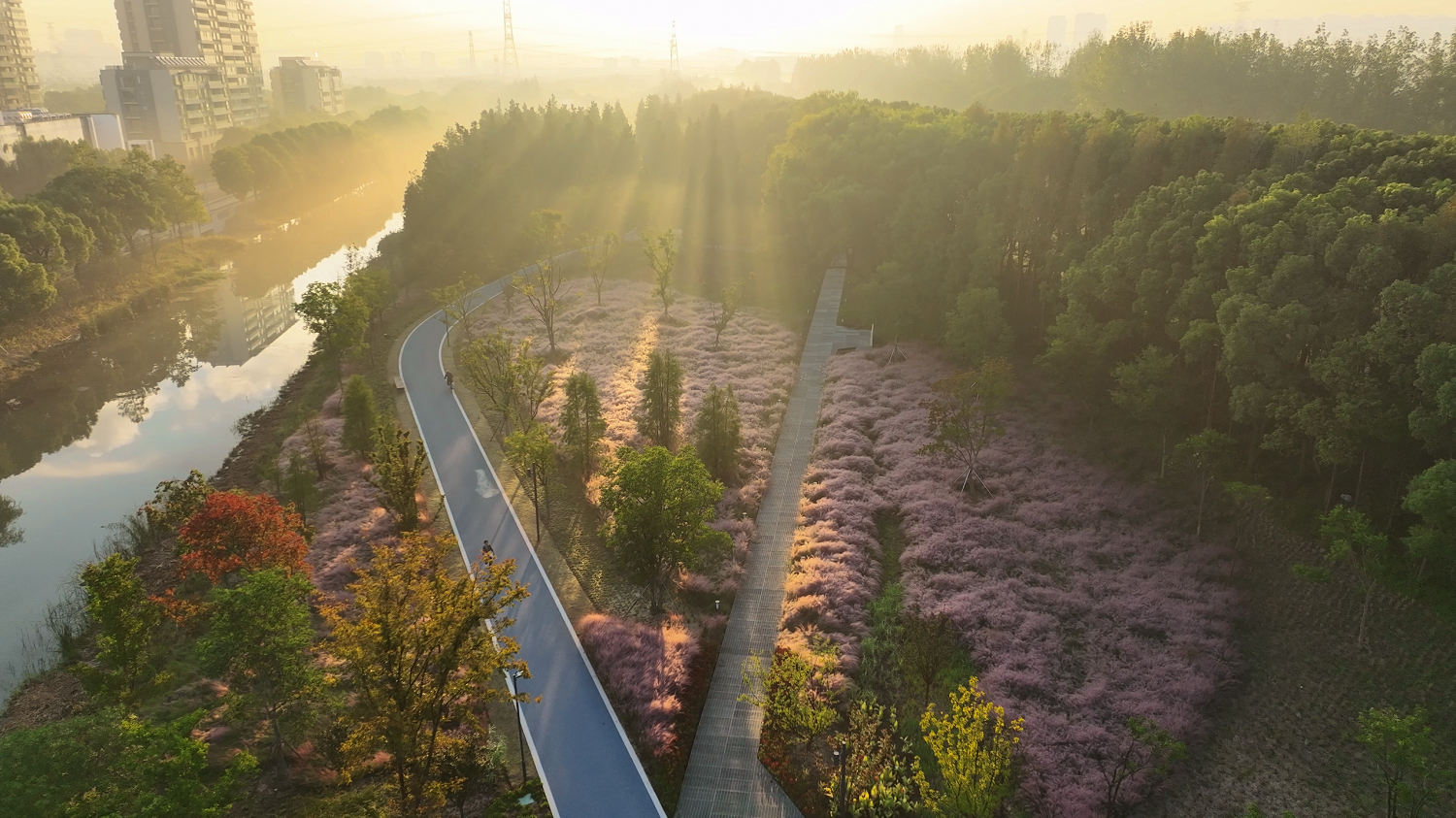 庙泾河生态廊道,青黄草木,蓝色步道,粉色旖旎,河廊道内粉黛如烟似霞。
